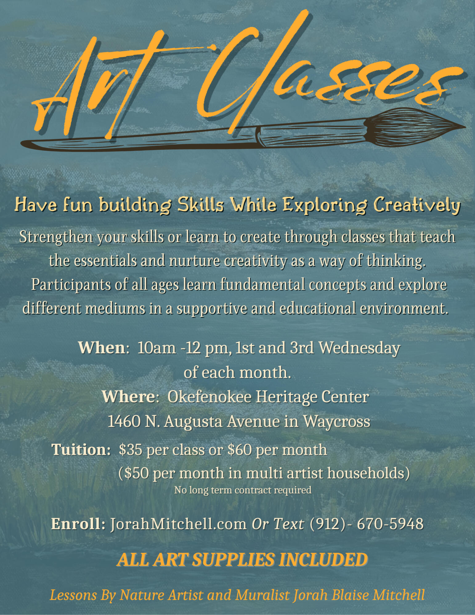 Discover, Create, and Grow with Art Classes at the Okefenokee Heritage CenterJoin us twice a month for hands-on art classes where we explore a new technique or medium each session. These aren’t casual paint parties — they’re fun, engaging lessons designed to help you strengthen your skills and spark your creativity.Classes are open to all ages (recommended for ages 10 and up). Each project is built on solid fundamentals, giving you tools you can carry into your own artwork long after class ends. Whether you’re just beginning or looking to refine your practice, you’ll leave inspired, confident, and ready to create more.